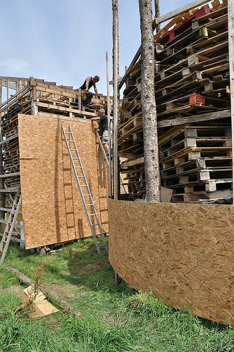 A bit of a slow start with the erection of the rest of the poles, logistical problems. We still crack on and keep the site as clear as possible, stacking the pallets within the structure and sorting the wood that can be used.