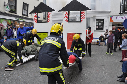 The theme of the game was that teams of 2 put on a full fireman's gear and had to carry a stretcher to the trees where they have to save a pet stuck up that tree, then with the pet safe on the stretcher it was onto the fire where they had to put out the flames with a water pistol then onto the next task which was to transfer water from buckets into a pipe until the duck can be reached. With both the pets safe on the stretcher they had to rescue the person from the burning house (each person weighed 50 kilo`s) and take the person and the 2 pets back to the start line.