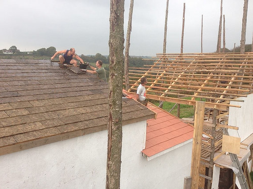 A good team working today. I was on painting duties, with Neil Batty and Mark Keeley ensuring the stirling board was covered with an "undercoat" in readiness for the cladding of the buildings and Brian Pitts was painting the "tiles" for the roof in readiness for Damien Witney, Cody Marchant and Wayne Stapleton to continue with the roofing.