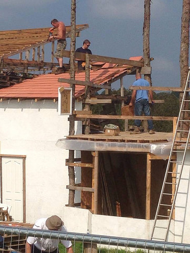 I have been away on Holiday for 2 weeks so apologies for no updates. The boys have been busy; the roove's have been started and the pub is nearly completed structurally. Isnt it looking good?